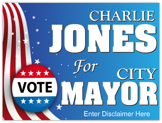 Design your own campaign sign with our Mayoral Election Template. Once you open the sign Template in our designer you can change the text, fonts, colors and sizes. From there you can save your custom political sign and proceed to checkout or continue shopping.